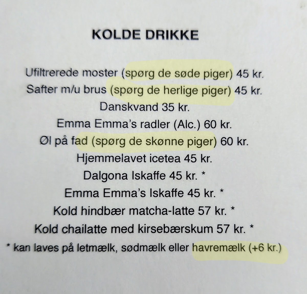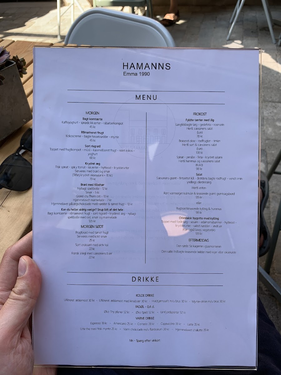Finally, the VARME DRIKKE (Hot Drinks) menu features classic coffee options like Espresso, Americano, Cortado, Cappuccino, and Latte, ideal for a cozy afternoon break. And for wine enthusiasts, Emma Emma offers a curated wine selection, so don't hesitate to ask for the wine list.