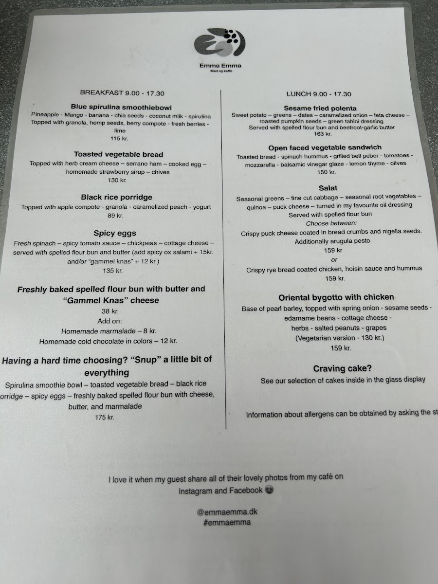 The menu at Emma Emma, located at Gammel Munkegade 5, 8000 Aarhus Centrum, offers a delightful selection that spans various times of the day, from breakfast to afternoon snacks and drinks. Starting with MORGEN (Breakfast), the menu features comforting and hearty options such as Kanel-banan-brød (cinnamon banana bread), Ristet grøntsagsbrød (toasted vegetable bread), and the rich Sort risgrød (black rice porridge). For a more savory touch, there’s Krydret æg (spiced eggs), and for something light yet satisfying, try the Nybagt speltbolle med smør og Gammel Knas (freshly baked spelt roll with butter and Old Crunch).